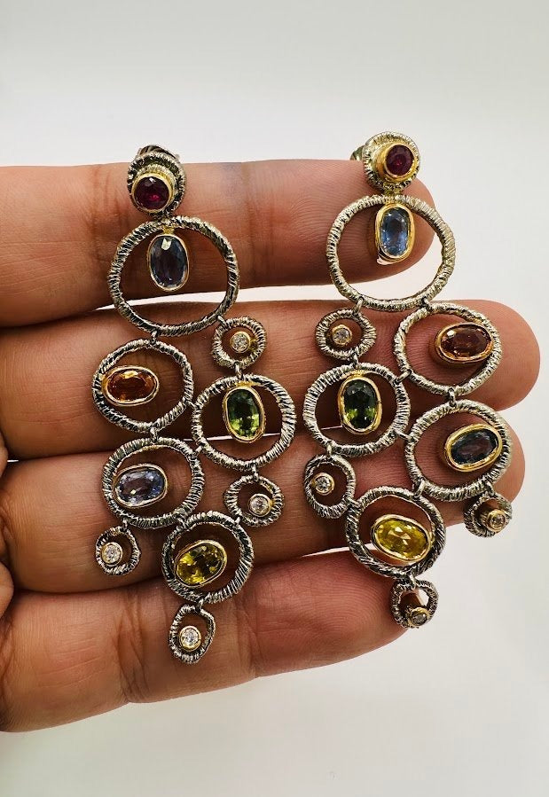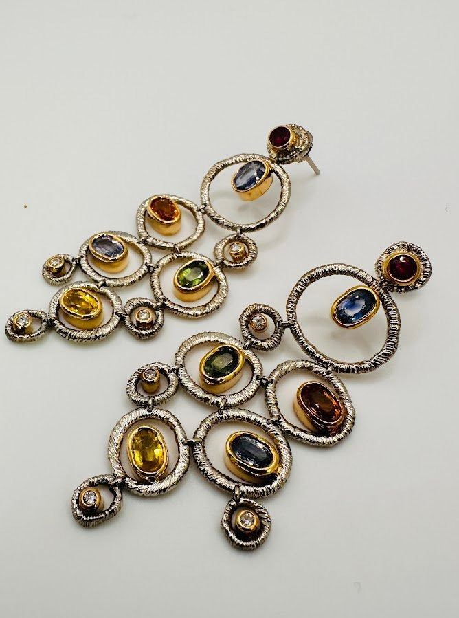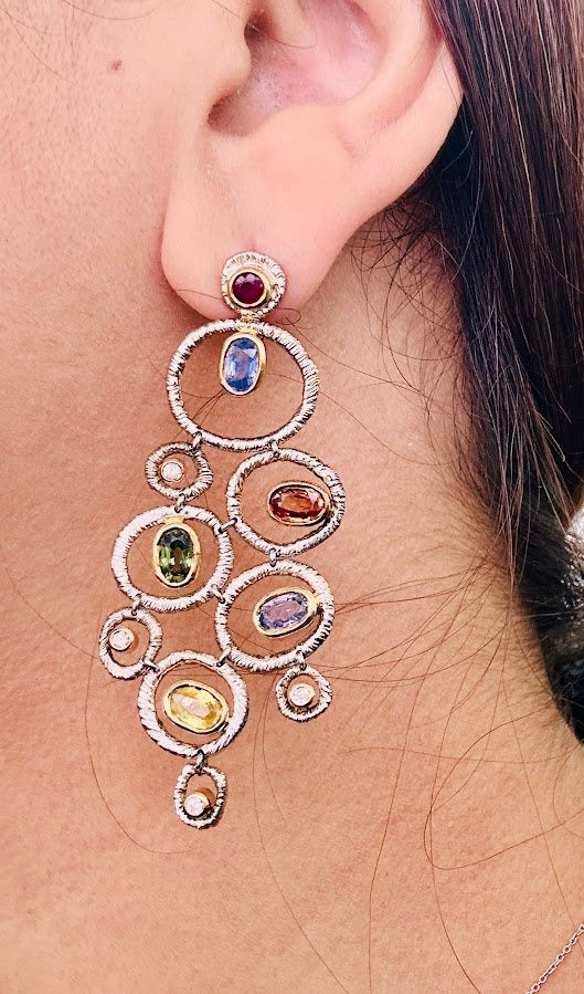 Custom Order Cancellation Deal Natural “green ,yellow , blue ” Sapphires in 18Karat Gold Dangle Earrings ,also sets with Natural Diamonds and one ruby on each earring , earrings weights 21.98 Grams