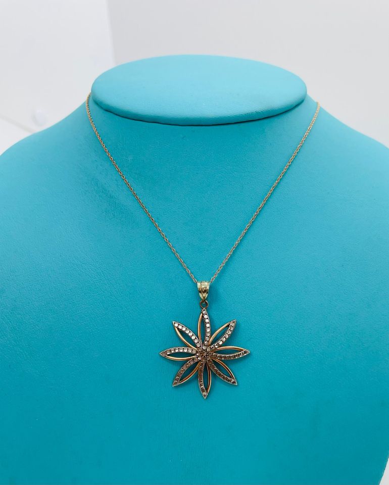 Beautiful 14Karat Two Tone Flower Necklace , comes with 18″ chain and diamond cut design on the flower for more brilliance .