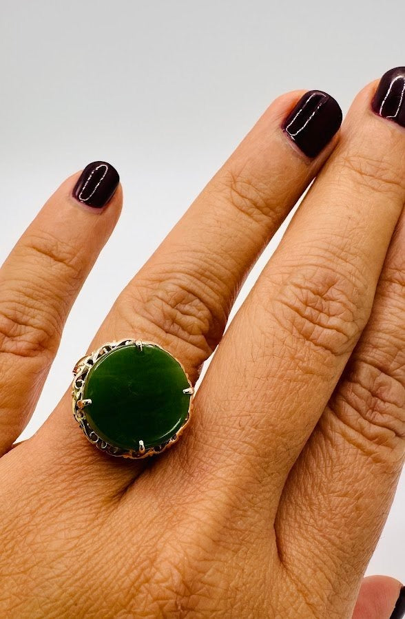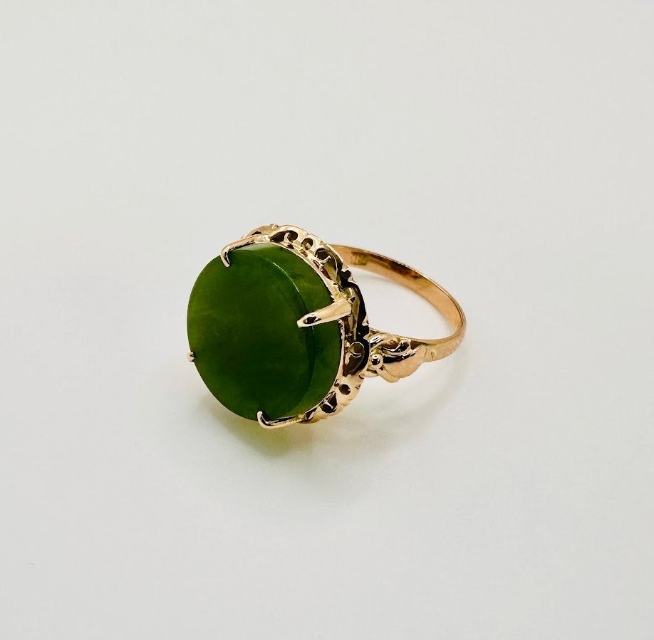 Consignment Vintage Gold Jade Ring in 10 Karat Gold , 17mm Stone