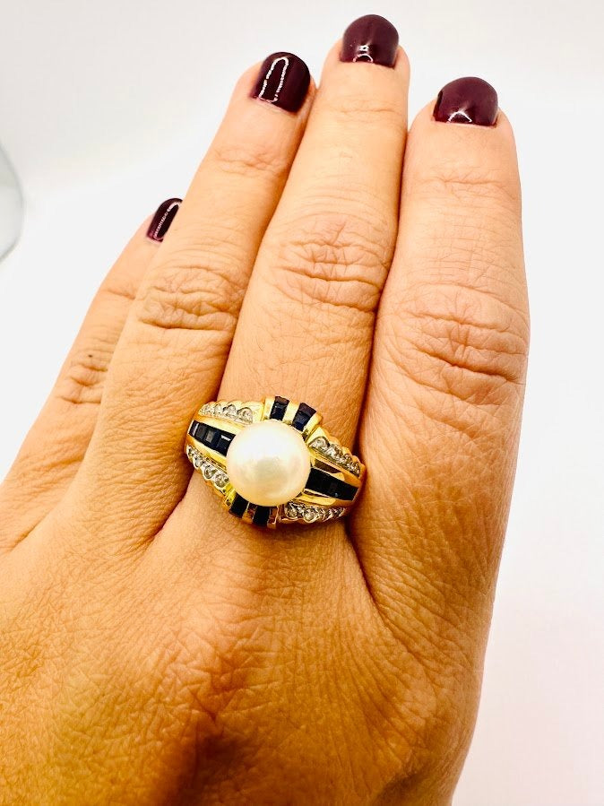High End Consignment 18Karat Pearl , Diamonds & Sapphires Ring